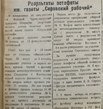Результаты эстафеты им. Газеты «Серовский рабочий». – Текст : непосредственный // Серовский рабочий. – 1943. – 18 мая (№ 95). – С. 1.
