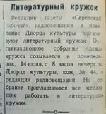 Литературный кружок. – Текст : непосредственный // Серовский рабочий. – 1943. – 13 июня (№ 114). – С. 2.