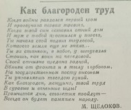 Щелоков М. Как благороден труд / М. Щелоков. – Текст : непосредственный // Серовский рабочий. – 1945. – 8 марта (№ 40). – С. 2.