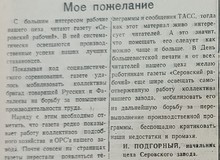 Подгорный И. Мое пожелание / И. Подгорный. – Текст : непосредственный // Серовский рабочий. – 1943. – 5 мая (№ 86). – С. 2.
