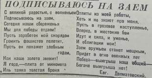 Долматовский Е. Подписываюсь на заем / Е. Долматовский. – Текст : непосредственный // Серовский рабочий. – 1942. – 25 апреля (№ 83). – С. 2.