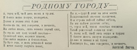 Лестов А. Родному городу / Анатолий Лестов. – Текст : непосредственный // Серовский рабочий. – 1942. – 19 декабря (№ 244). – С. 1.