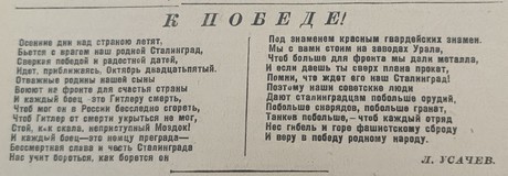 Усачев Л. К Победе / Л. Усачев. – Текст : непосредственный // Серовский рабочий. – 1942. – 30 октября (№ 204). – С. 2.