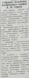 Собрание молодежи, посвящённое памяти А. К. Серову. – Текст : непосредственный // Серовский рабочий. – 1941. – 20 июня (№ 143). – С. 3.