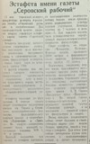 Эстафета имени газеты «Серовский рабочий». – Текст : непосредственный // Серовский рабочий. – 1941. – 15 апреля (№ 88). – С. 2. – (На городские темы).