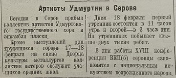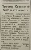 Триумф Серовской самодеятельности. – Текст : непосредственный // Серовский рабочий. – 1941. – 11 марта (№ 58). – С. 4.