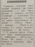 Киноновинки. – Текст : непосредственный // Серовский рабочий. – 1941. – 9 февраля (№ 33). – С. 4.