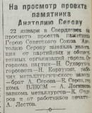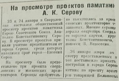 На просмотр проекта памятника Анатолию Серову. – Текст : непосредственный // Серовский рабочий. – 1941. – 24 января (№19). – С. 4.