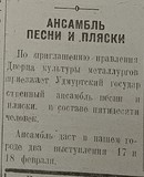 Ансамбль песни и пляски. – Текст : непосредственный // Серовский рабочий. – 1941. – 6 февраля (№ 30). – С. 4.