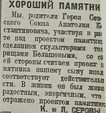 Серов К. Хороший памятник / К. Серов, Л. Серова. – Текст : непосредственный // Серовский рабочий. – 1941. – 26 января (№ 22). – С. 4.