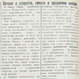 Лекция о старости, смерти и продлении жизни. – Текст : непосредственный // Серовский рабочий. – 1941. – 29 мая (№ 124). – С. 4.