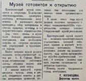Кузнецова Т. Музей готовится к открытию / Т. Кузнецов. – Текст : непосредственный // Серовский рабочий. – 1941. – 8 мая (№ 106).