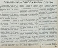 Гречаник. Поликлиника завода имени Серова / Гречаник. – Текст : непосредственный // Серовский рабочий. – 1941. – 14 мая (№ 111). – С. 2.