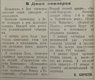 Борисов Б. В Доме пионеров / Б. Борисов. – Текст : непосредственный // Серовский рабочий. – 1941. – 9 января (№ 7). – С. 2.