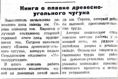 Книга о плавке древесно-угольного чугуна. – Текст : непосредственный // Серовский рабочий. – 1941. – 18 мая (№ 115). – С. 4.