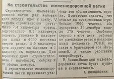Козловский А. На строительство железнодорожной ветки / А. Козловский. – Текст : непосредственный // Серовский рабочий. – 1944. – 26 декабря (№ 170). – С. 1.