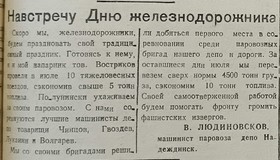 Людиновсков В. Навстречу Дню железнодорожников / В. Людиновсков. – Текст : непосредственный // Серовский рабочий. – 1943. – 17 июля (№ 138). – С. 1.